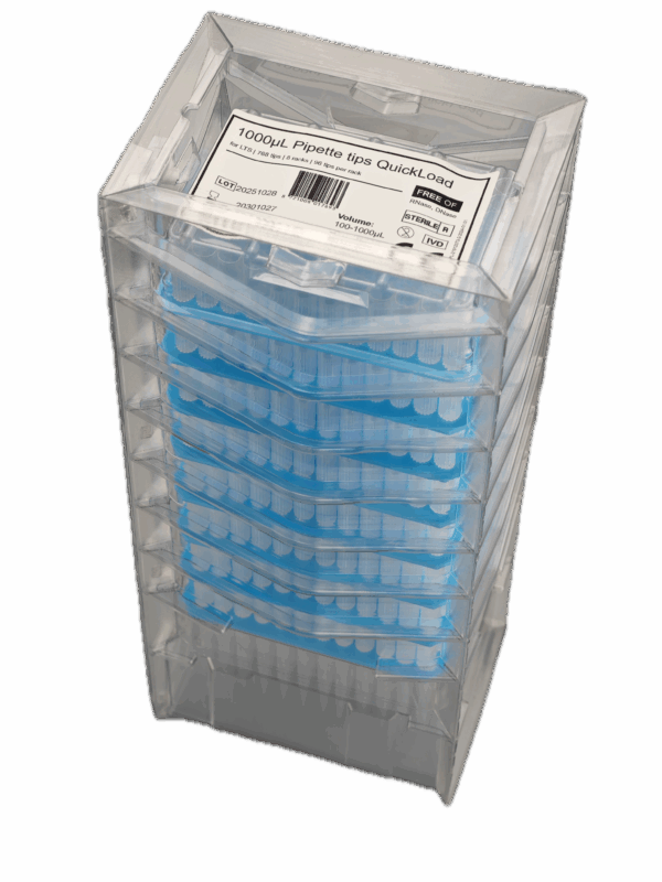 OmniFlux® 1000μl Pipetpunten | Geschikt voor Rainin® LTS® in QuickLoad Packs zijn specifiek gemaakt voor laboratoria die gebruik maken van de Rainin LTS pipetten. Ervaar het verschil met het LTS LiteTouch systeem van Rainin in combinatie met de OmniFlux® Pipetpunten. Deze innovatieve verpakkingen zijn ontworpen om direct op het rack te worden gedrukt, waardoor het wisselen van pipetpunten moeiteloos verloopt. Gemaakt van PET-materiaal, bieden onze navulverpakkingen niet alleen gebruiksgemak maar dragen ze ook bij aan een milieuvriendelijke werkomgeving doordat deze significant minder plastic bevatten ten opzichte van reguliere racks.
